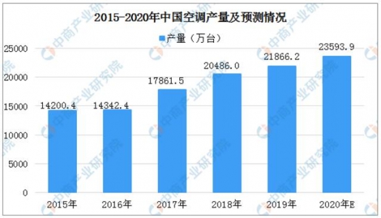據(jù)國家統(tǒng)計局數(shù)據(jù)顯示:2019年我國空調(diào)總產(chǎn)量為21866.2萬臺,相比2018年提升6.74%。據(jù)中商產(chǎn)業(yè)研究院預測,2020年我國空調(diào)總產(chǎn)量將達23593.9萬臺。